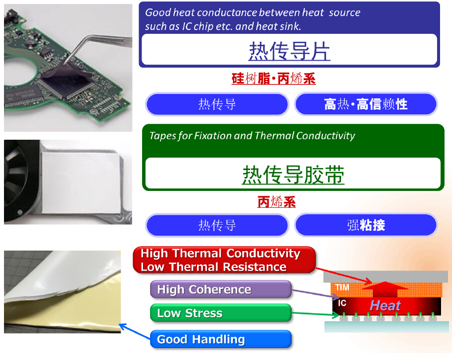 :散熱片(Heat Conductive Sheet),用于CPU, IC等熱源與對應散熱器之間的散熱材料,硅系片材,熱傳導膠帶